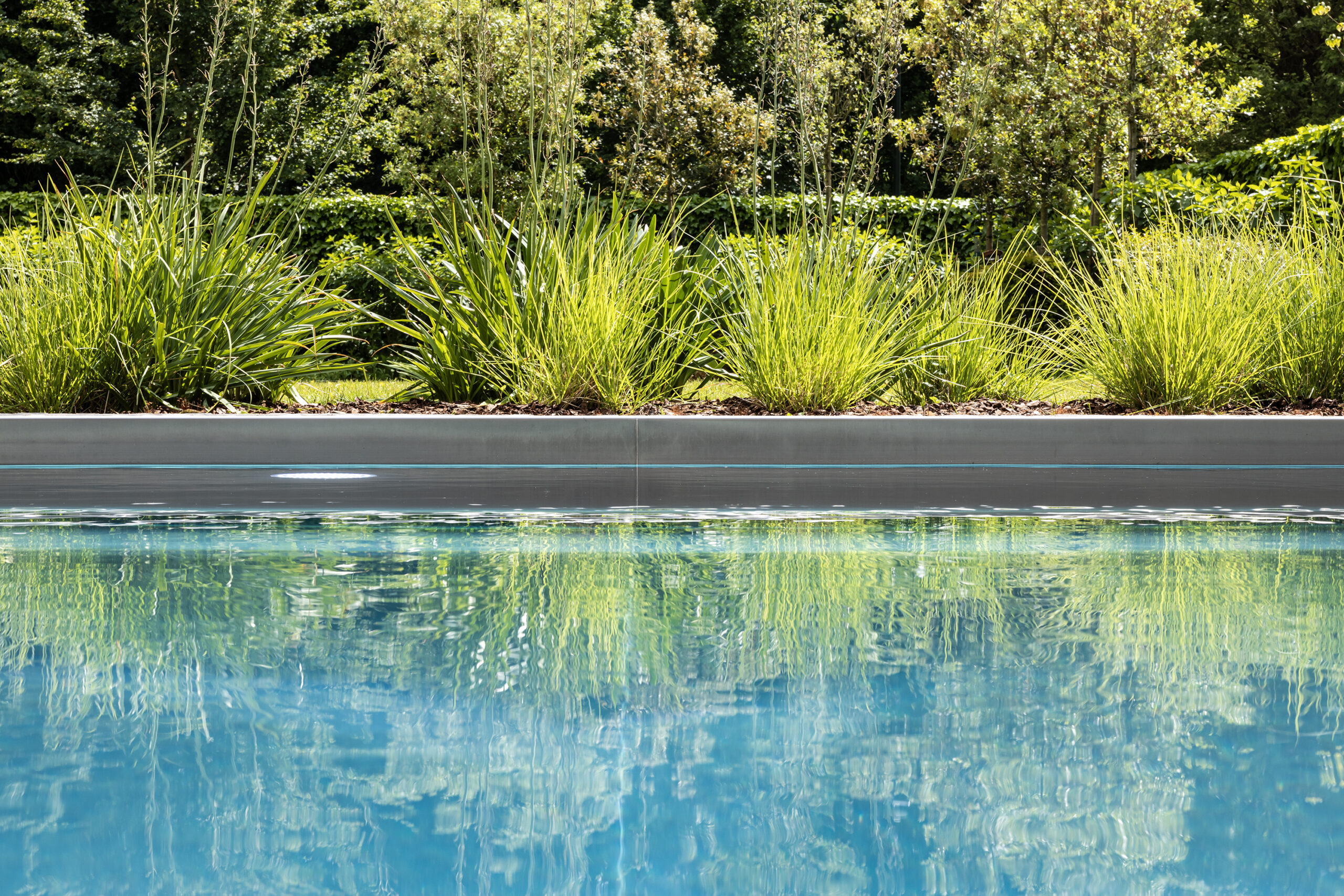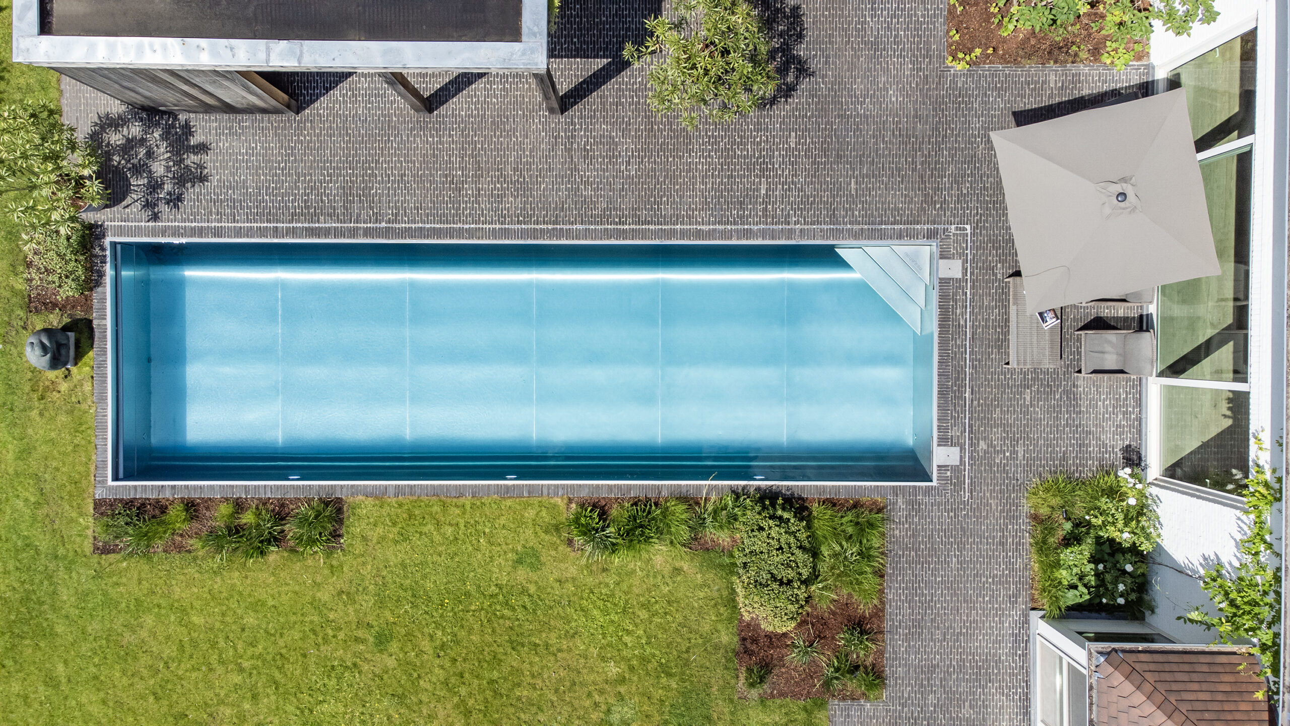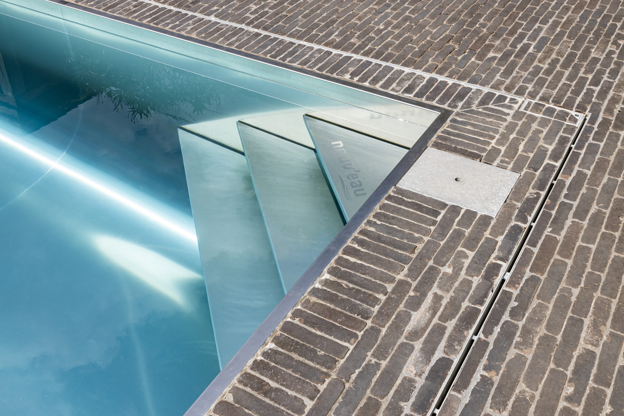 Eine Treppe, die aus der Ecke des Bades herausführt und nach vorne schwebt.